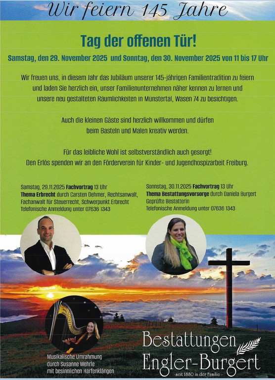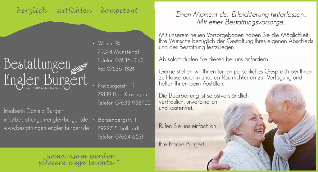 Unser herzlicher Familienbetrieb ist in Münstertal, Staufen, Bad Krozingen, Schallstadt und Umgebung im Trauerfall seit vielen Jahren kompetent für Sie da.
